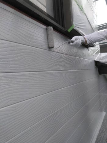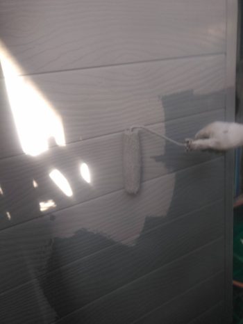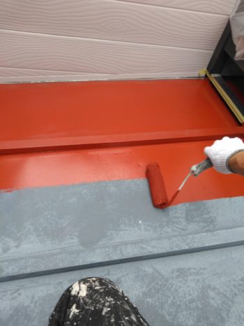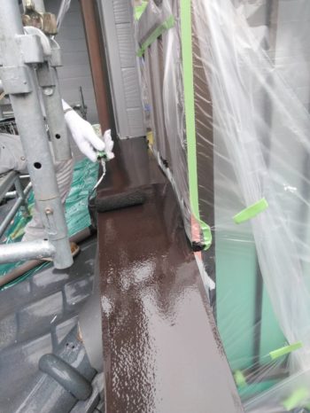 軒天上塗りを丁寧に塗っていきます。周りに飛ばないよう低飛散ローラーで塗っています