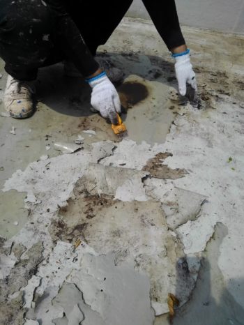 すごい量剥がれます。これでは防水の機能をはたしません。丁寧に取り除いていきます