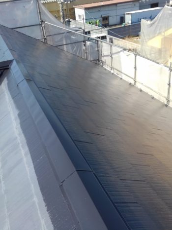 コロニアル屋根中塗りの様子です。細かい所を先に刷毛で入れていきローラーで塗っていきます。